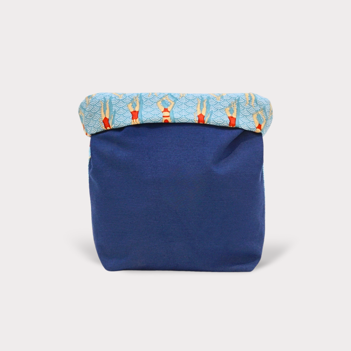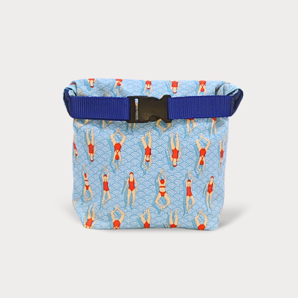 Our bestseller, the Bikini Bag! Its exterior is made from 2 different fabrics for the front and back. The inside is made from upcycled discarded inflatables and is splash proof. It also comes with a click closure so you can attach it to other bags.