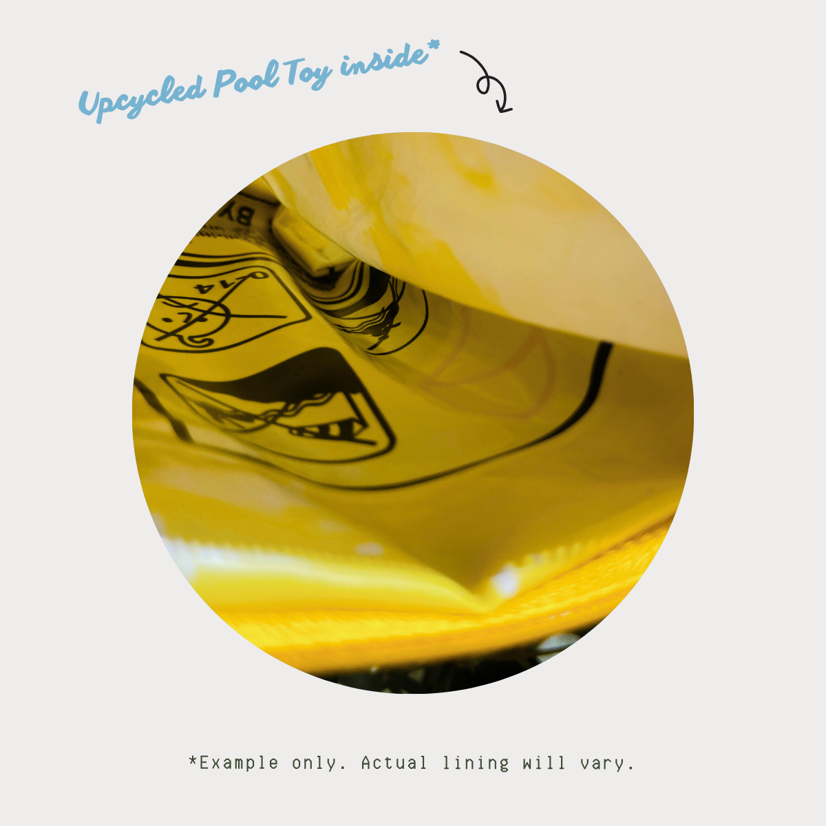 Our bestseller, the Bikini Bag! Its exterior is made from 2 different fabrics for the front and back. The inside is made from upcycled discarded inflatables and is splash proof. It also comes with a click closure so you can attach it to other bags.