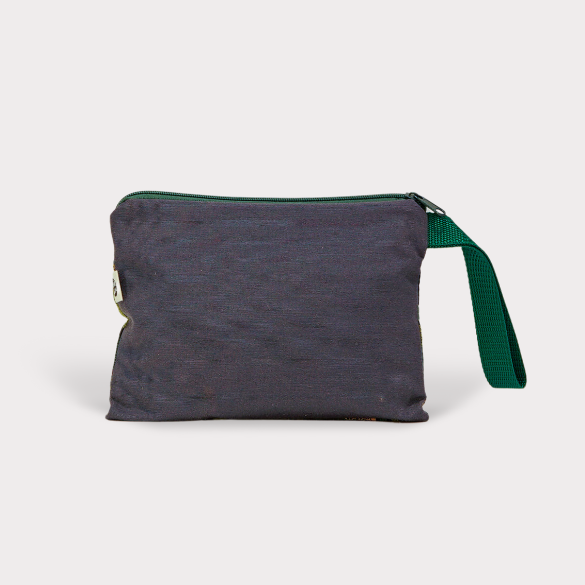 Zipped pouch with handle. Exterior has 2 different fabrics for the front and back. The inside is made from upcycled discarded inflatables and is splash proof. Perfect size for sunscreen, sunglasses and phone, or use it as a packing cell to keep your suitcase organized...