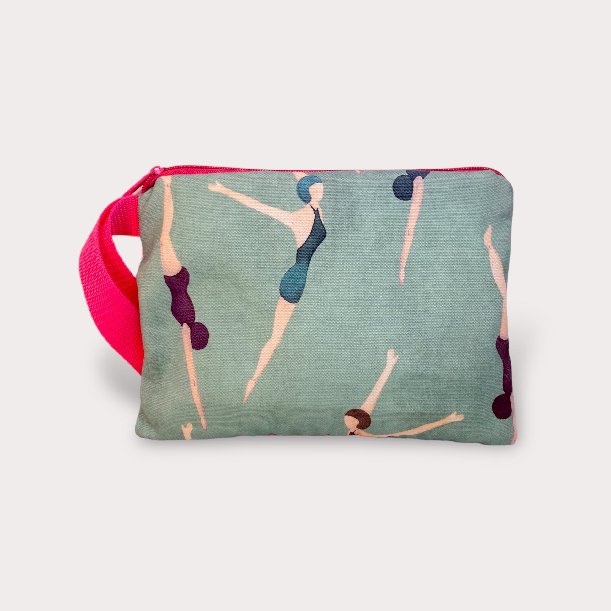 Zipped pouch with handle. Exterior has 2 different fabrics for the front and back. The inside is made from upcycled discarded inflatables and is splash proof. Perfect size for sunscreen, sunglasses and phone, or use it as a packing cell to keep your suitcase organized...